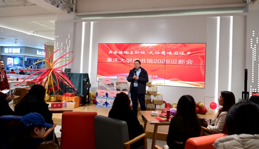 活动伊始,现场播放了温馨的暖场视频。视频以生动的画面回顾了2025年重庆大学图书馆人在工作中的精彩瞬间,每一个片段都凝聚着馆员们的坚守与付出,引发了现场全体馆员的强烈共鸣,为活动奠定了温暖而热烈的基调。暖场结束后,魏群义馆长发表热情洋溢的致辞。他首先回顾了过去一年图书馆在资源建设、读者服务、文化推广、情报和学科服务等方面取得的丰硕成果,向全体馆员的辛勤付出与无私奉献致以衷心的感谢和崇高的敬意。他表示,图书馆的发展离不开每一位馆员的坚守与担当,希望大家在新的一年里继续凝心聚力、携手并进,以更饱满的热情、更务实的作风推动图书馆事业再上新台阶。温暖有力的话语让现场氛围愈发浓厚,也让全体馆员倍感振奋与鼓舞。